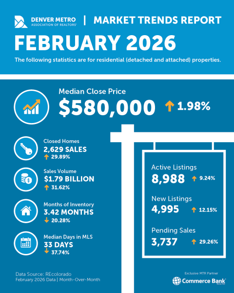 Overall, the February data points to a market gaining momentum as it moves toward the spring season. Increased closings, rising prices, faster selling times, and strong pending sales all suggest growing confidence among both buyers and sellers as the Denver metro housing market transitions into its traditionally busiest time of year.